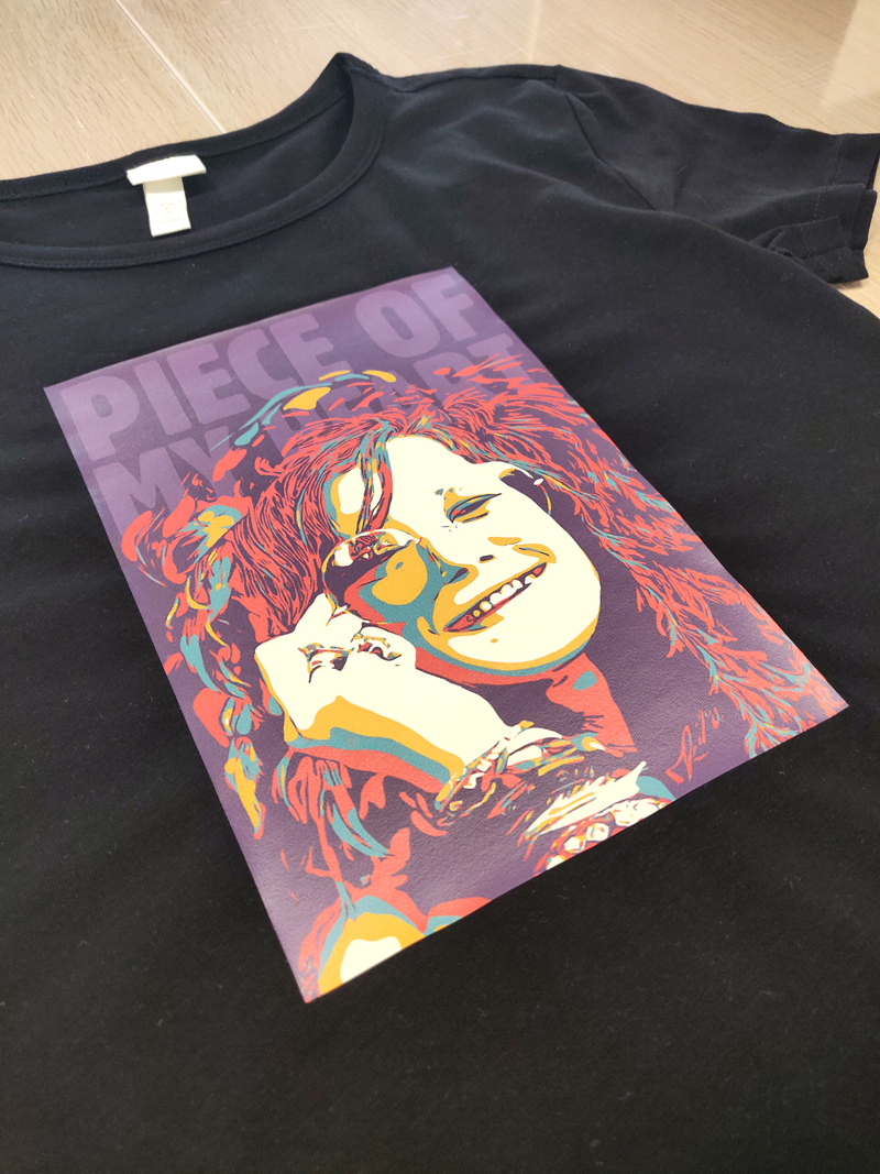 Hier wird das Bild oder der Text zunächst auf eine Trägerfolie aufgedruckt, die dann mit einer Transferpresse komplett auf den Stoff übertragen wird. Die Transferfolie lässt sich ähnlich wie Papier mit sämtlichen Farben und Rasterungsmethoden bedrucken.